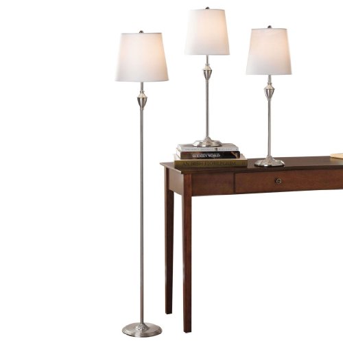| Post Date : Apr 17, 2012 00:03:14 | Usually ships in 1-2 business daysA Brylanehome Exclusive!Gorgeous 3-pc. lamp set completes your living room decor. Each features a 3-way switch to adjust brightness: dim, medium, bright. Includes: one 58"H floor lamp and two 29"H table lamps. Crafted of metal with satin-brushed, nickel-plated finish, 10"Diam. fabric shade and on/off switch. Wipe clean. UL Approved, 150-watt bulb for floor lamp, 40-watt bulb for table lamps (not included).Set Of 3.